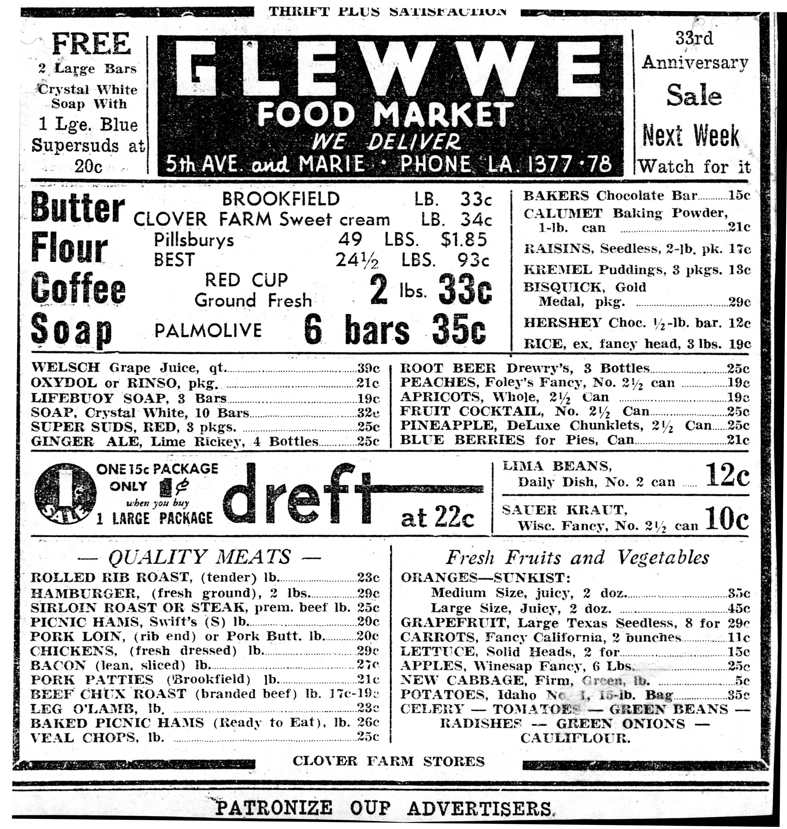 Apples were sold by the barrel. Russets, New York Baldwins, Spitzenbergers and the winter Greenings. No fancy wrapped apples as we have them today . Oranges were not a "year around" item but would be on the market during the Holliday season. Grape Fruit was just beginning its appearance and was slow in gaining popularity with the consumer. •