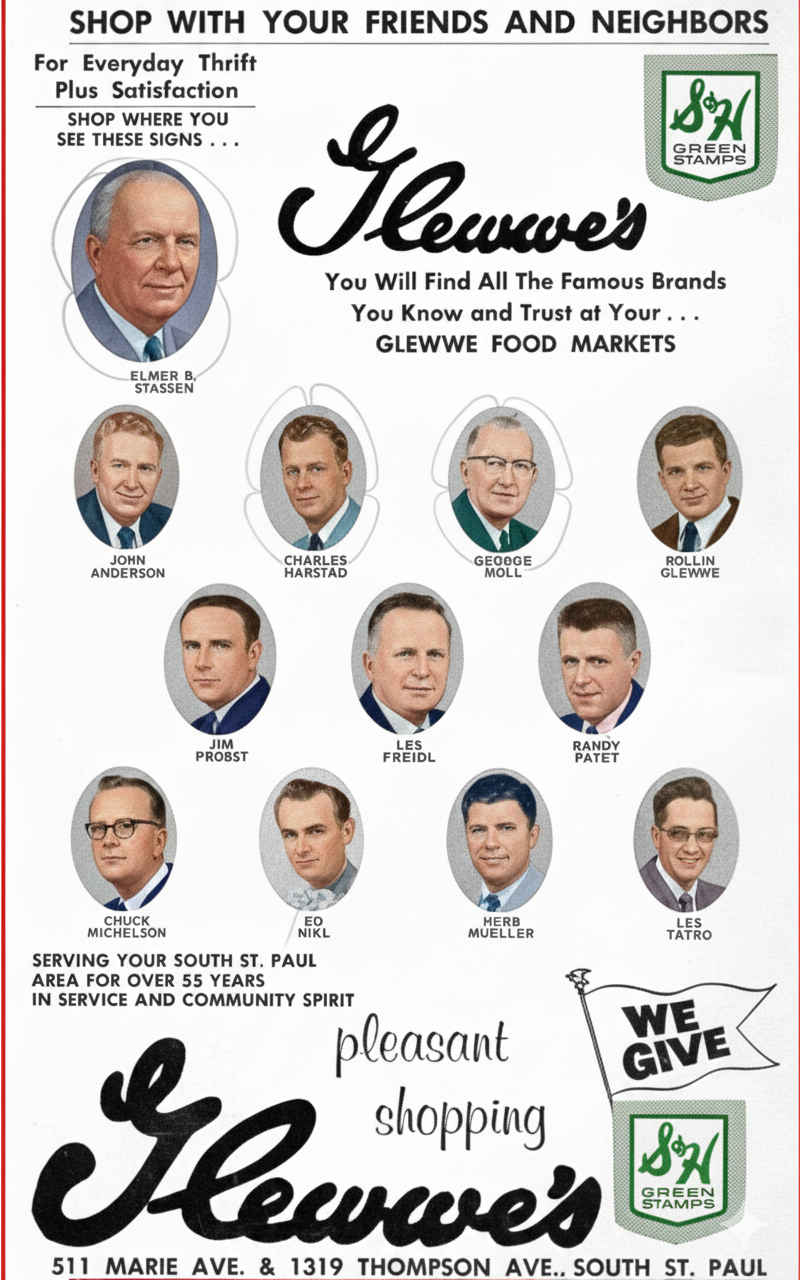 Fifty years is a long time to look back and recall what the grocery Business was like. It was even earlier than that, to be exact on March 1st - 1905 when the first Grocery on the hill of So.St.Paul was opened for business on the southeast corner of Second Street No. and Fourth Ave. Illness prevented the continuation and the business was sold after one year. In 1908 business was again resumed at 139- Fifth Ave. So. In a building built by H.Thasse and in recent years used as an Undertaking Parlor. In 1912 another move was made to the corner of Fifth and Marie