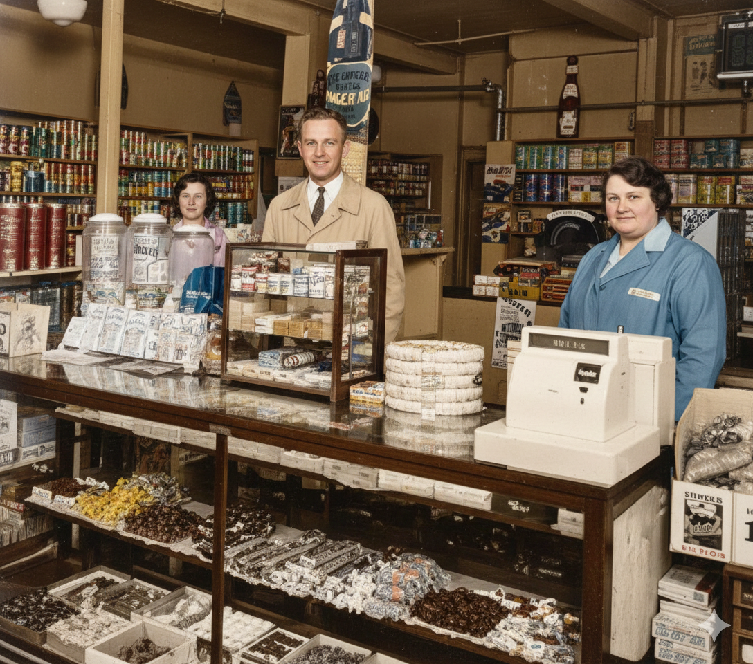 You should be able to visualize the candy department. Trays of Licorice sticks, Wine Balls. Peanut Brittle, Fudge squares, Gum Drops, Striped peppermint sticks, and so many other kinds that having a dime to spend for candy was really a treat. Cookies and Crackers were also sold in bulk and most always sampled before purchasing.